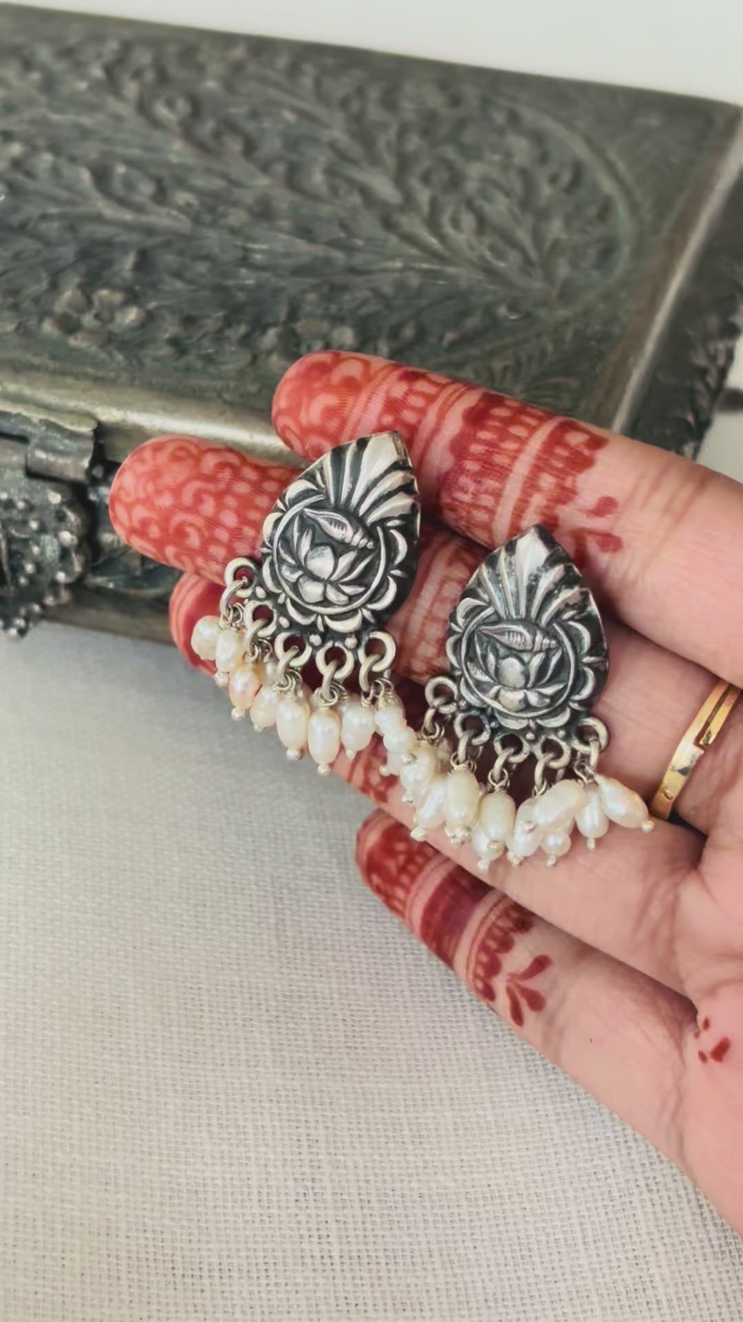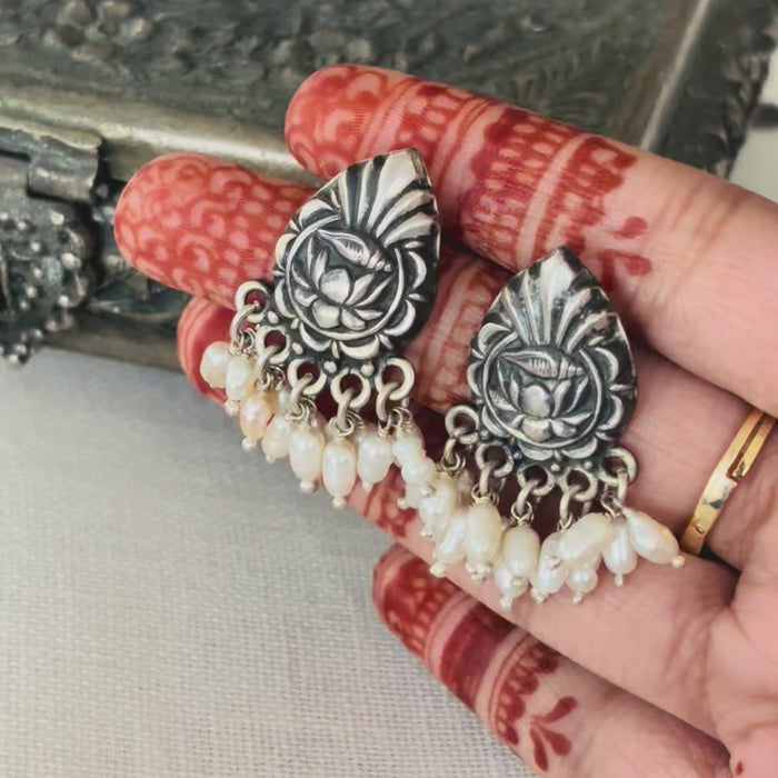 Quickshop Graceful silver oxidised earrings with intricate floral designs and dainty pearl detailing....