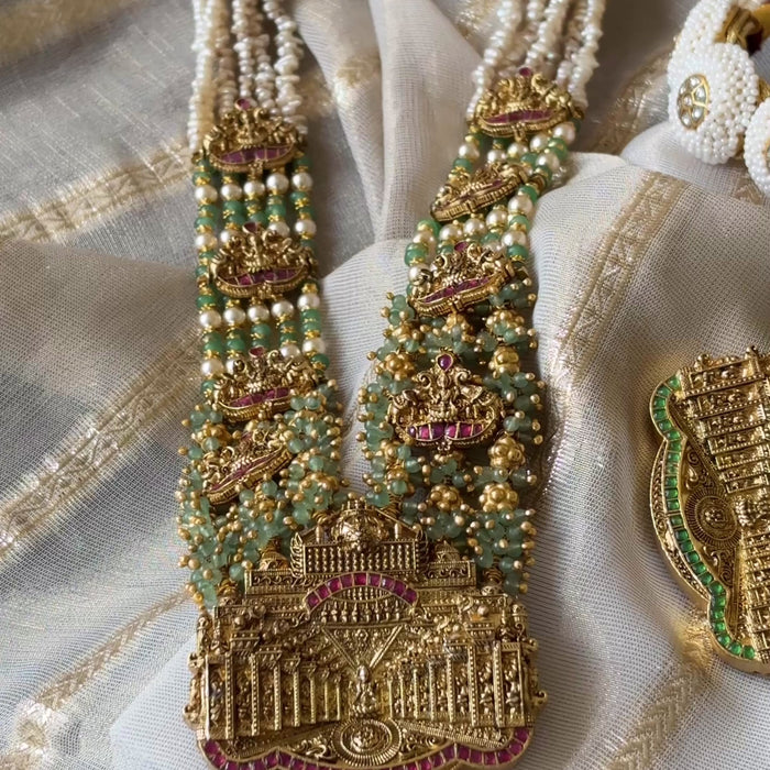 A stunning tribute to heritage and craftsmanship, the Gold Polish Temple Nagas Necklace is a bold yet elegant piece handcrafted in 92.5 sterling silver. Featuring traditional naga (serpent) motifs inspired by South Indian temple art, this necklace is adorned with rich accents that bring a vibrant touch to its antique silver finish. Perfect for festive occasions and cultural celebrations, it beautifully blends divine symbolism with timeless style.