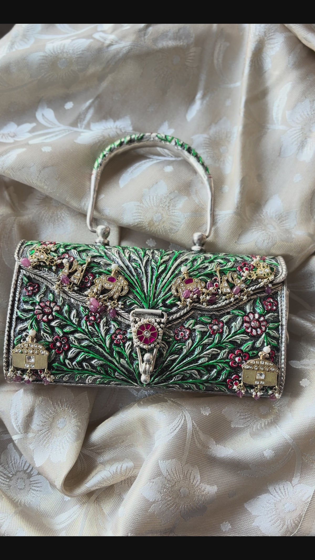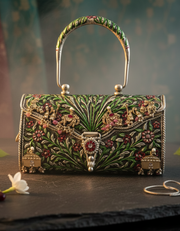 The Silver Green Garden Purse is a graceful blend of elegance and charm, inspired by nature’s beauty. Designed with a refreshing green garden motif set against a silver-toned base, this purse adds a refined touch to both traditional and contemporary outfits. Its compact yet stylish design makes it perfect for festive occasions, weddings, and special evenings, offering functionality without compromising on sophistication.