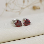 Red heart-shaped stone studs are a type of earring featuring a single, heart-shaped gemstone. The red stone, often made from materials like ruby, garnet, or a synthetic alternative, is cut into a heart shape, which gives the earrings a romantic and elegant look.