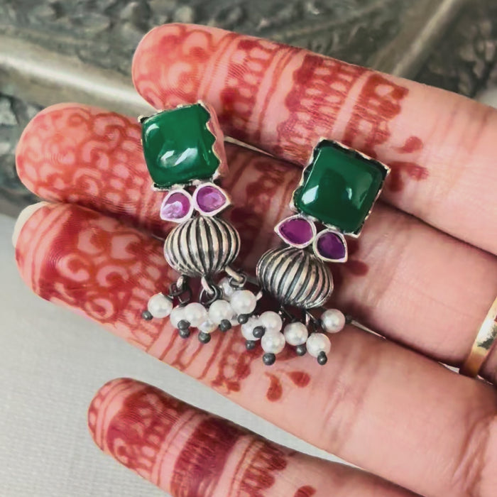 Green Stone Oxidised Silver Earrings with Pearl Drops