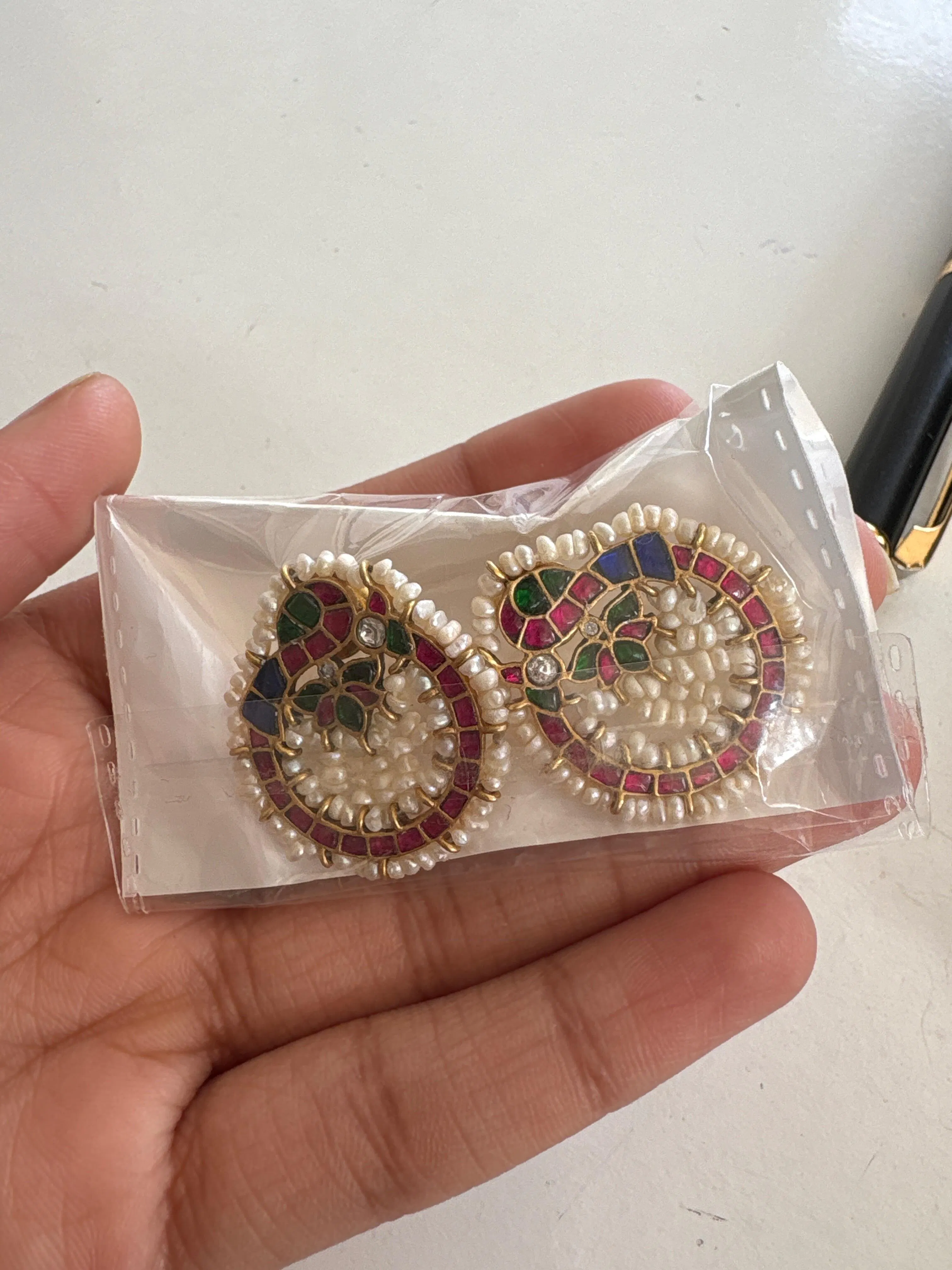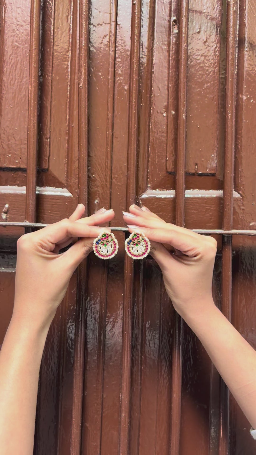 Add a pop of tradition to your look with these vibrant meenakari-inspired silver earrings, adorned with pearls and multicolored stones.
